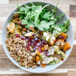 - Combine everything together. In a large bowl, combine the cooked farro, roasted vegetables, arugula, mandarins, pomegranate seeds and pistachios. Drizzle evenly with the dressing, then toss until combined.