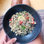 - Combine roasted vegetables with cooked quinoa & couscous plus remaining ingredients (red bell pepper through freshly ground pepper).