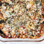 - In a 13 x 9 greased baking dish, add 1/2 marinara sauce. Layer ingredients in the following order x 2: roasted eggplant, ravioli, cheese. Repeat. Top with mozzarella & Parmesan cheese.