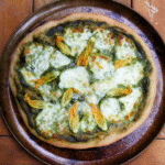 - After dough has risen, add basil puree on top, then add washed and dried squash blossoms plus mozzarella.